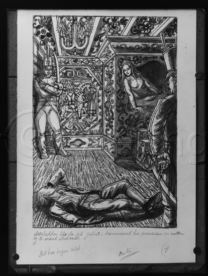 Askeladden lå da på gulvet i kammerset hos prinsessen om natten og to mann stod vakt